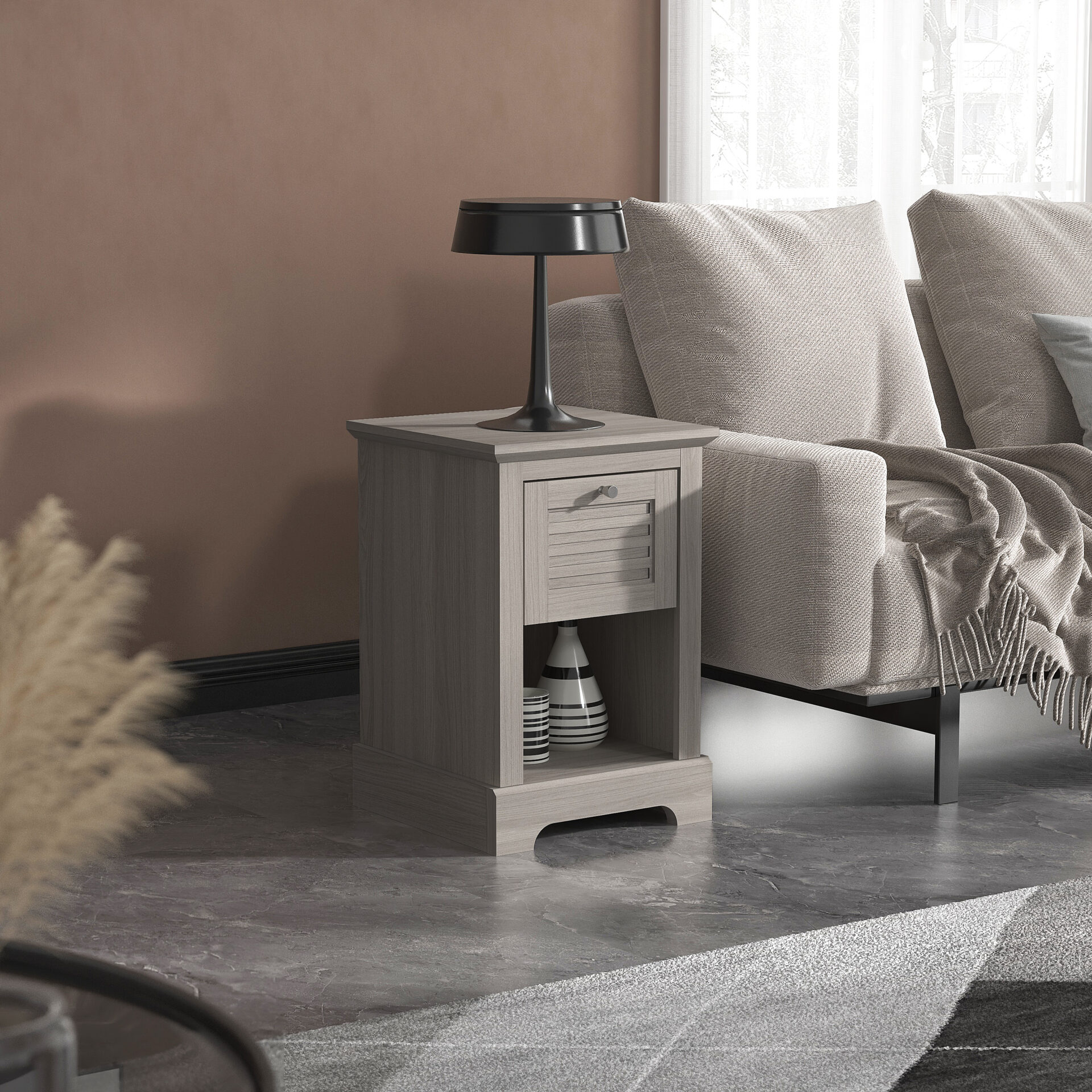 Add rustic charm to your living space with the Canyon Charcoal Grey Lamp Table, crafted in a contemporary grey wood finish with a convenient lower shelf for storage or display.